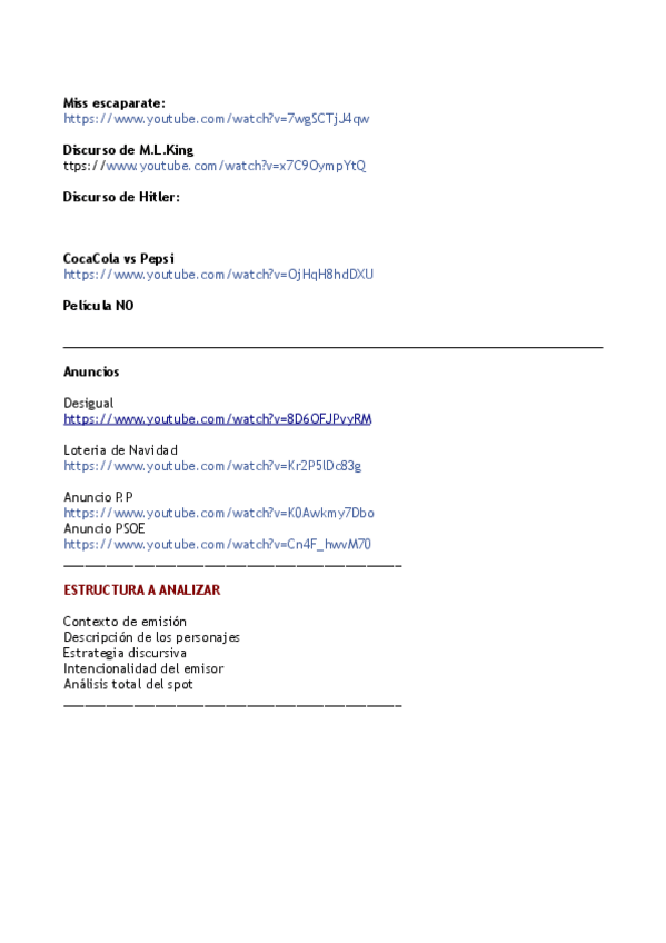 El examen es práctico. Ahí tenéis los documentales y spots que suele preguntar. Creo que lleva dos años seguidos cayendo el de la loteria de navidad (con su año correspondiente). Si le habláis de la situación de la mujer en la publicidad y del machismo os