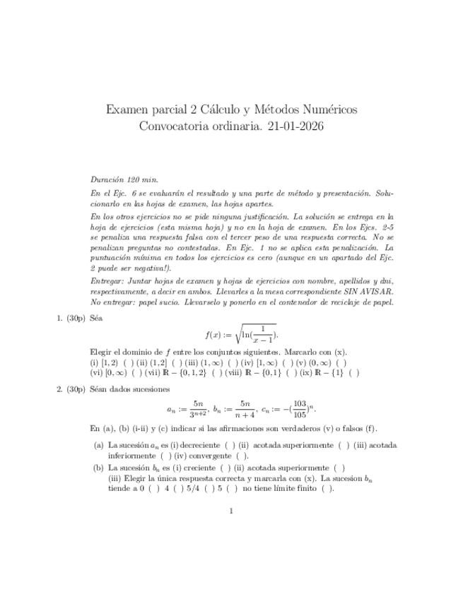 He publicado nuevos examenes de 1º Cálculo y Métodos Numéricos: Soluciones Parcial 2 ordinario 25-26