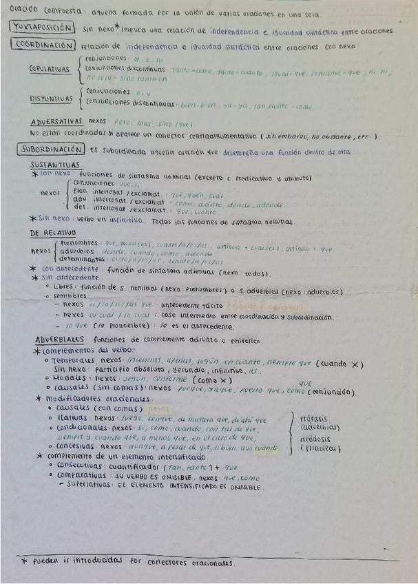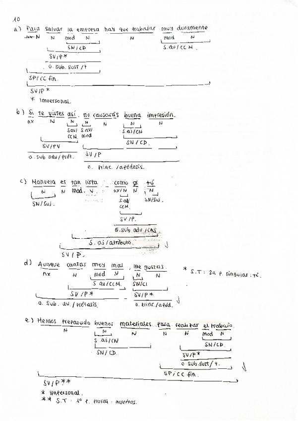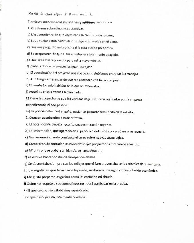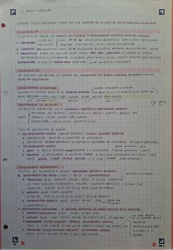 Oraciones analizadas sintácticamente resueltas y corregidas. Contiene principalmente oraciones sustantivas, de relativo y adverbiales. Bien organizadas y con buena letra. Saqué buena nota en selectividad (9 y pico sin optativas, nota final 12 y pico)