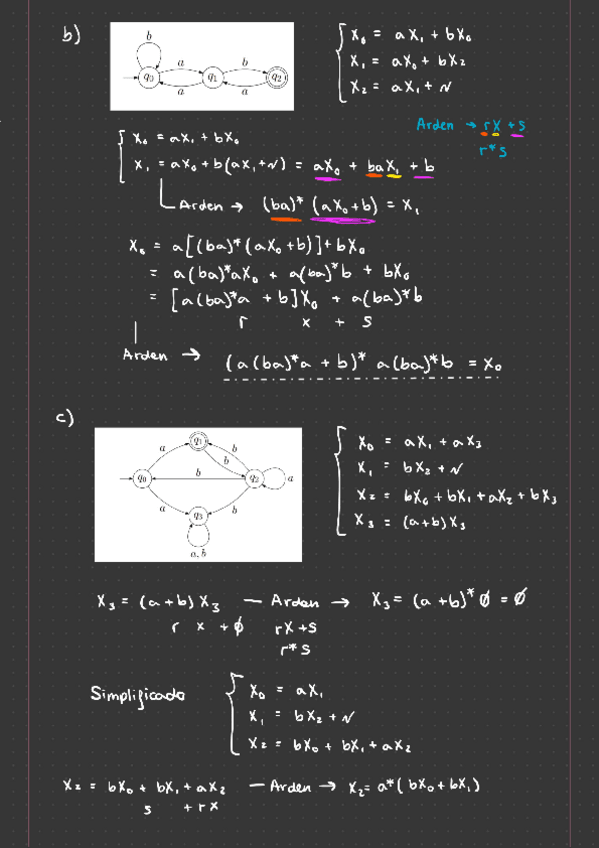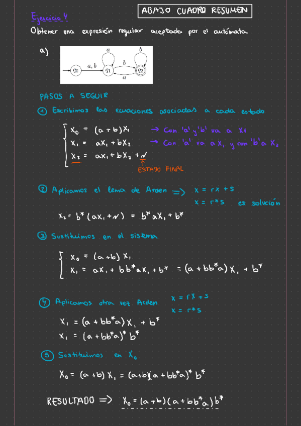 Cómo aplicar el Lema de Arden para el Analisis de automatas finitos con ejemplos del boletín de ejercicios del TEMA 5