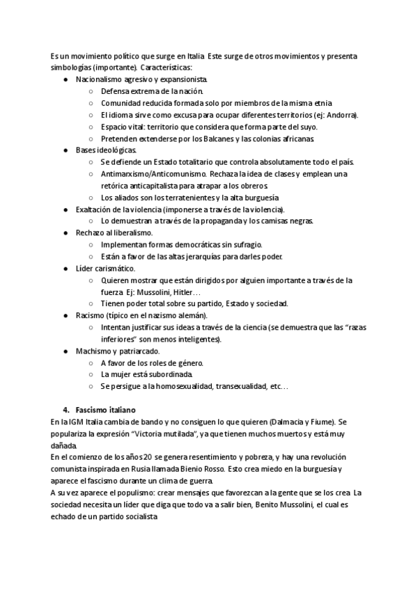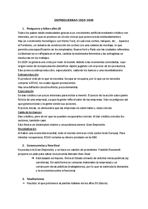 Apuntes del período de entreguerras (1920-1939). Contiene: - Postguerra y felices años 20. - Consecuencias y New Deal. - Totalitarismos. - Fascismo italiano. - Partido Nacional Fascista. - Política exterior. - El nazismo alemán.