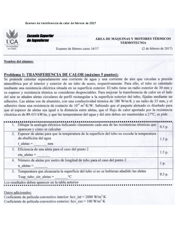 He publicado nuevos examenes de 1º Apuntes Variados: Examen de transferencia de calor de febrero de 2017.pdf