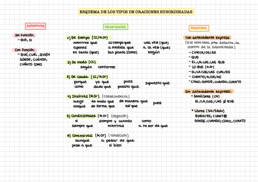 Esquema resumen con los tipos de oraciones subordinadas