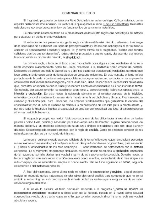 Ejemplo de comentario de texto filosófico (simulacro examen PAU) del autor DESCARTES - Preguntas I y II del modelo de examen respondidas. Texto: DISCURSO DEL MÉTODO. Creo que está muy bien y puede servir de ayuda!