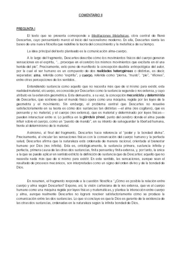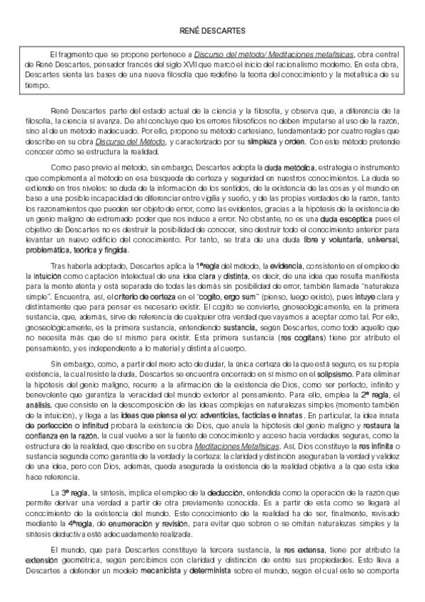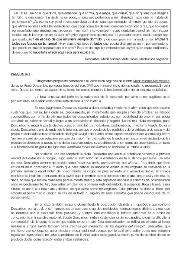 Ejemplo de comentario de texto filosófico (simulacro examen PAU) del autor DESCARTES- Preguntas I y II del modelo de examen respondidas. Texto: MEDITACIONES METAFÍSICAS. Creo que está muy bien y puede servir de ayuda!
