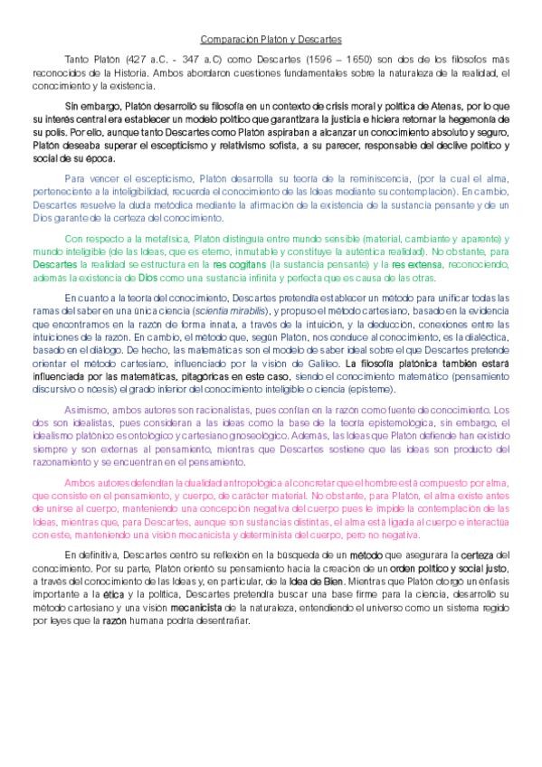 Comparación de autores: Platón y René Descartes, incluyendo la diferencia de contextos histórico-culturales y los intereses centrales de cada uno.