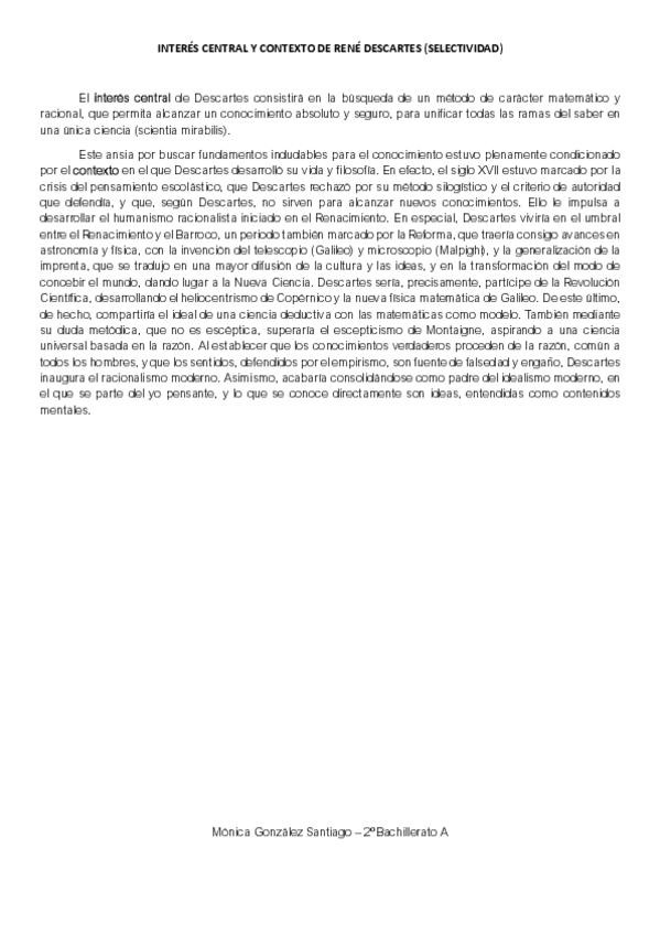 Interés central de la filosofía de René Descartes. Creo que es incluirlo en la pregunta II del examen de la PAU.