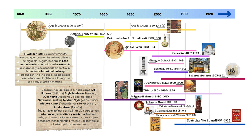 Una pequeña cronología para explicar el bloque 1 de diseño, que va desde el Arts & Crafts hasta los Deutscher Werkbund