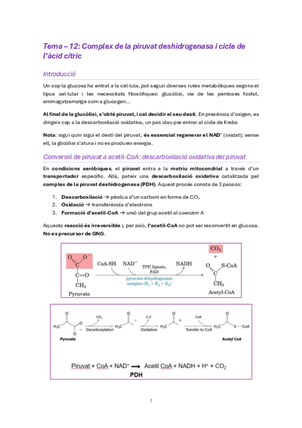 resum Tema-12 del cicle de Krebs i complex de la PDH