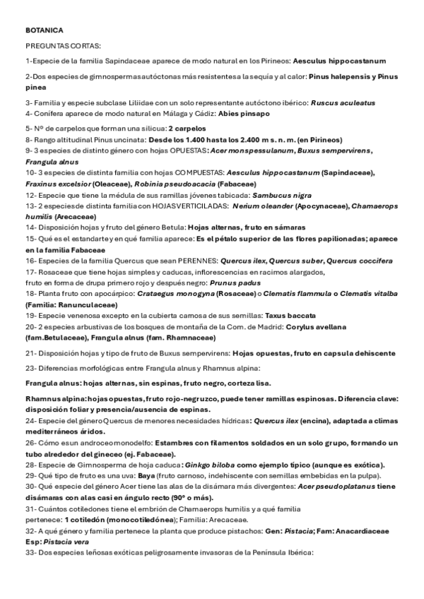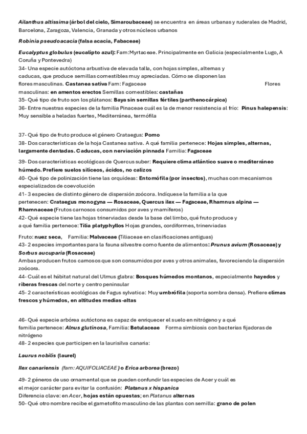 teoria de todas las especies de obligado reconocimiento+algunas importantes de la lista larga+ preguntas tipo de examen+tabla con algunas especies que forman masas arbóreas