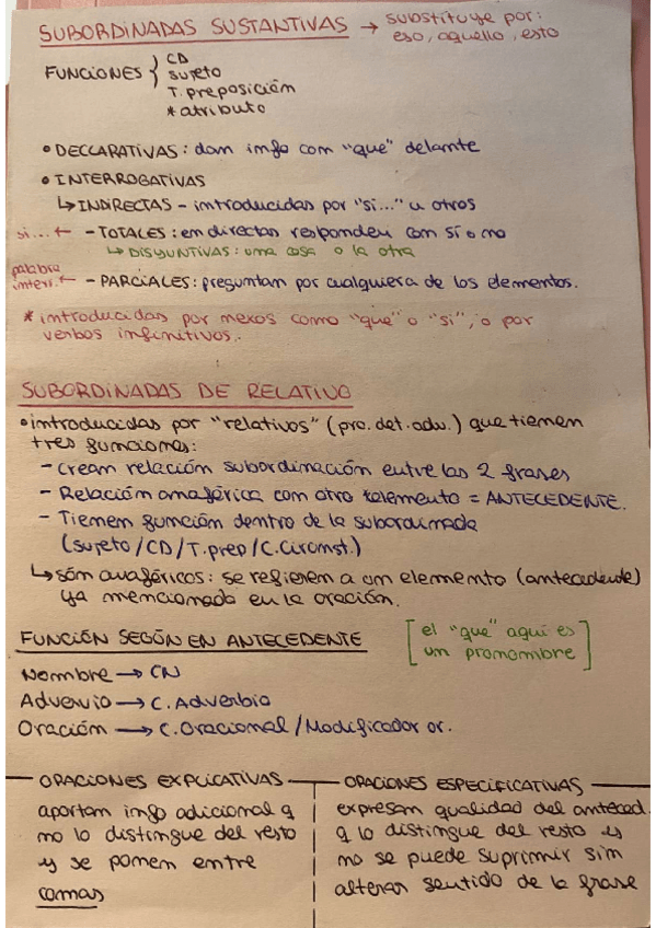 Esquema a mano sobre oraciones subordinadas (incluye de relativo sin antecedente expreso)