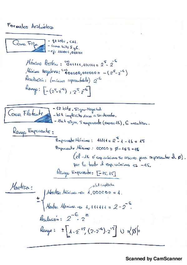 Resumen de los formatos de aritmetica. Falta algun ejemplo con Coma Fija en complemento a 2