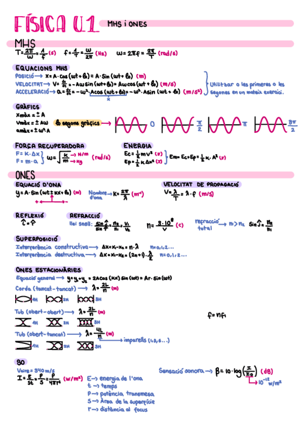 Resumen de apuntes y formulario U1 física 2n bachillerato en catalán, MHS i ones.