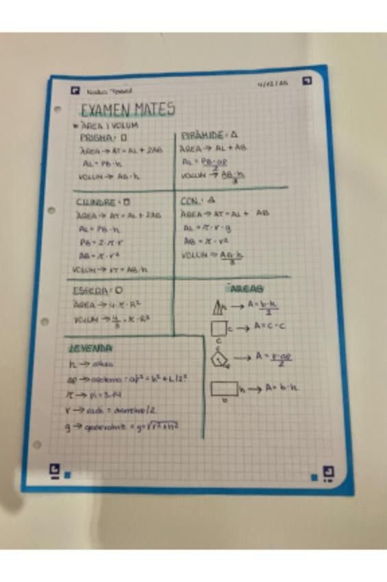 Resumen/esquema de geometría con la área y volumen de cueros en 3D: prisma, pirámide, cilindro, cono y esféra.