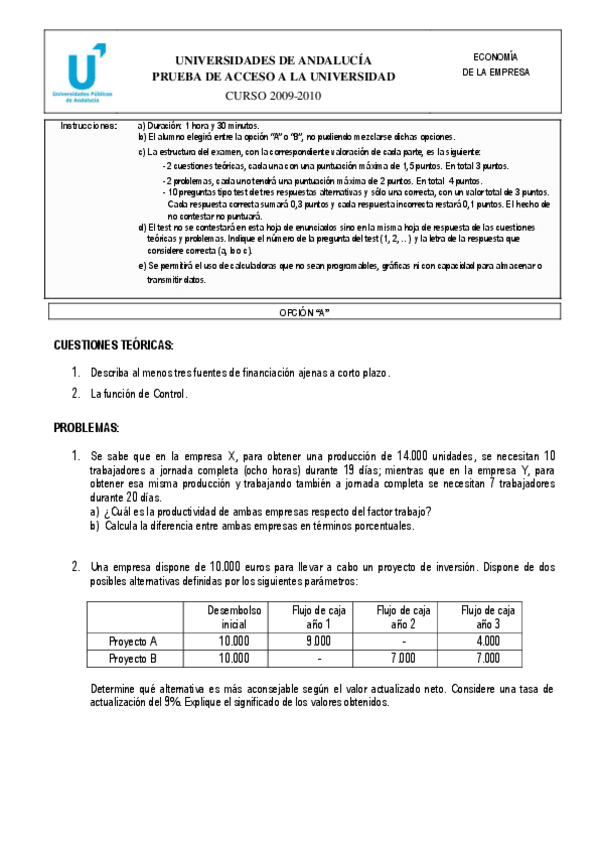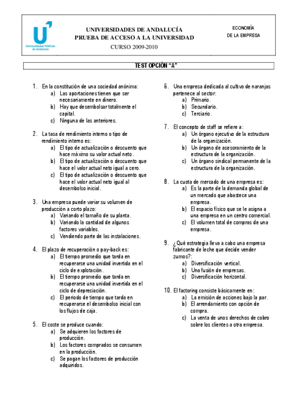 todos los exámenes de selectividad /pau/prueba de acceso a la universidad desde 2010 al 2020 de economía de la empresa