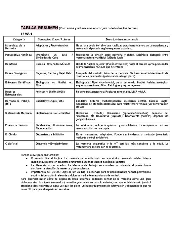 Hay tablas resumen de cada tema individual, y al final una de todos los temas juntos