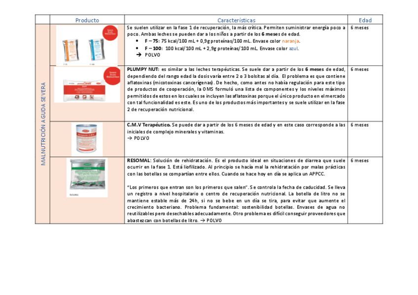Tablas de clasificación productos para la desnutrición en NUTRICIÓN en situaciones de EMERGENCIA