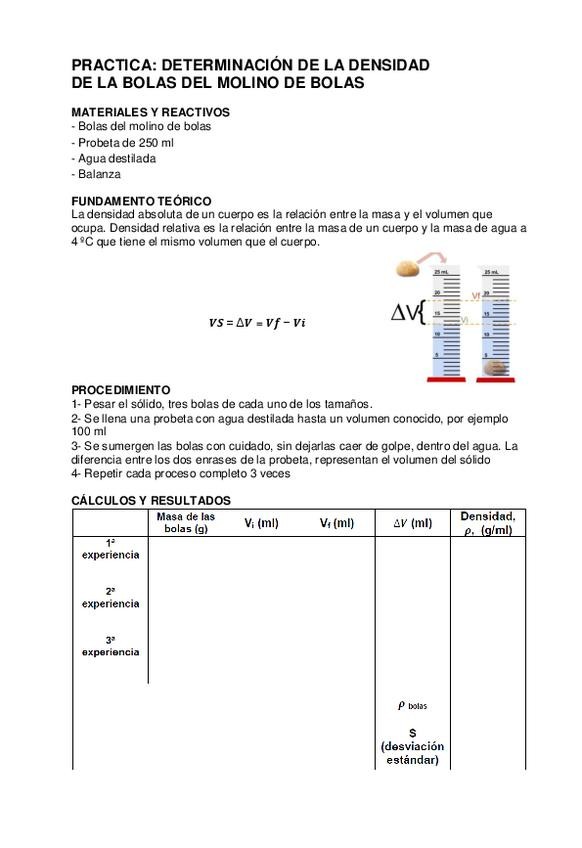 Cálculo de volumen y densidad de esferas para molino de bolas mediante el método de desplazamiento de volumen del agua en probeta.