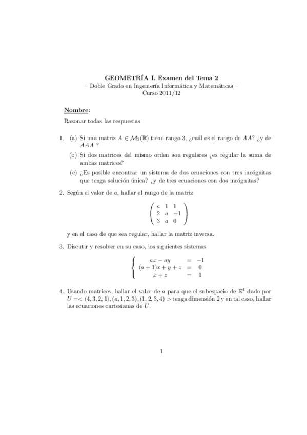 He publicado nuevos examenes de 1º Geometría I: Matemáticas