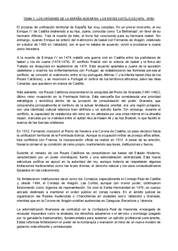 SÚPER RESUMEN del TEMA 1 de historia moderna (Reyes católicos) - Redactado tipo examen