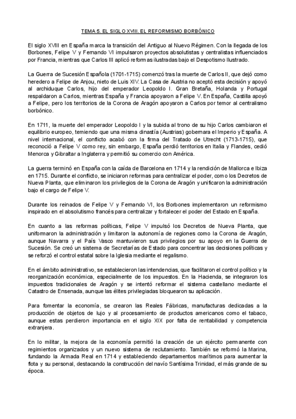 SÚPER RESUMEN del TEMA 5 de historia moderna (Reformismo borbónico) - Redactado tipo examen