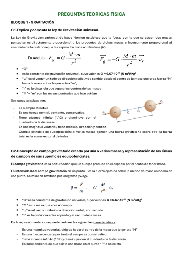 Apuntes claros y completos de las preguntas teóricas de los 4 bloques de Física, gravitación, electromagnetismo, ondas y física moderna, que me ayudaron a obtener un sobresaliente en la PAU de Aragón de 2025.