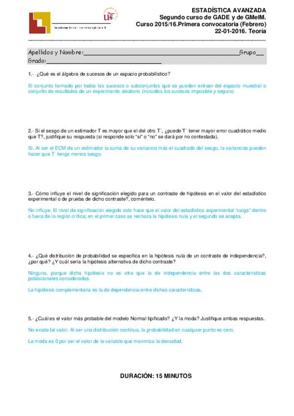 He publicado nuevos examenes de 2º Estadística Avanzada: Convocatoria de Febrero. 22-01-2016 Enunciados y soluciones.pdf