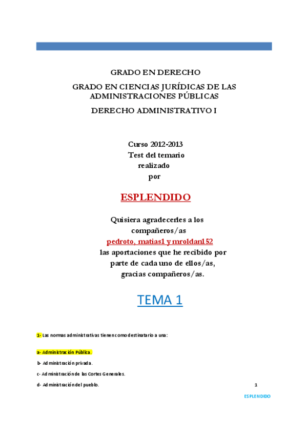 He publicado nuevos apuntes de 1º Derecho Administrativo I: ESPLENDIDO Test Derecho Administrativo I Versión II.pdf