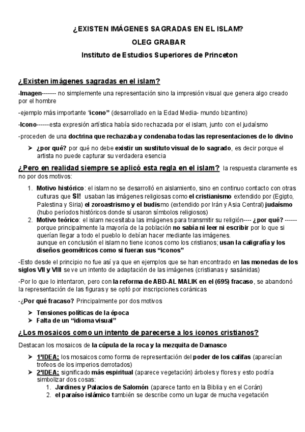 RESUMEN DE LA LECTURA OBLIGATORIA DE OLEG GRABAR ¿EXISTEN IMÁGENES SAGRADAS EN EL ISLAM?