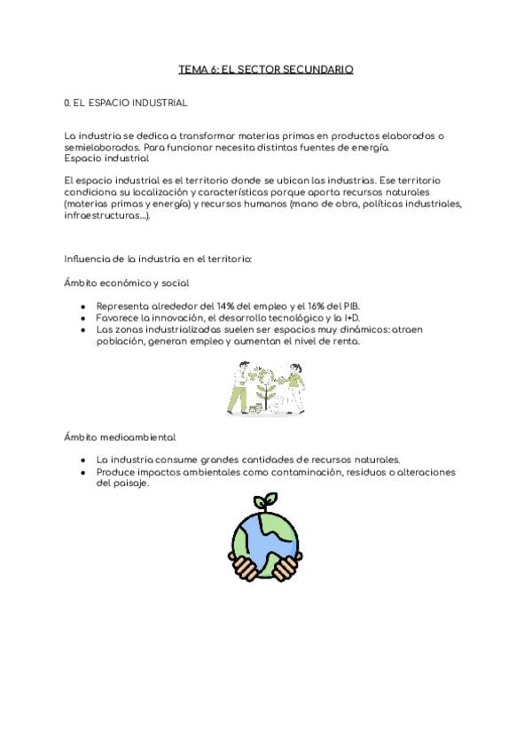 Hola chicos, aquí os dejo mis apuntes del tema 6 de Geografía de 2º de Bachillerato: el sector secundario. Están organizados para que podáis repasarlos rápido. ¡Espero que os sirvan mucho! ?