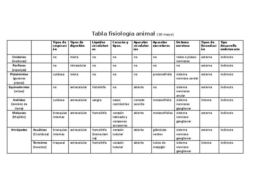 Tabla resumen fisiologia animal biologia 1 de bachillerato