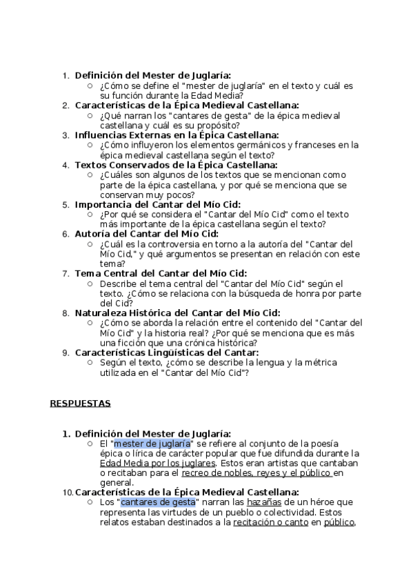 En este documento aparecen posibles preguntas de examen que pueden ser usadas para practicar sobre el Cantar de juglaría y sobre la obra de Mio Cid