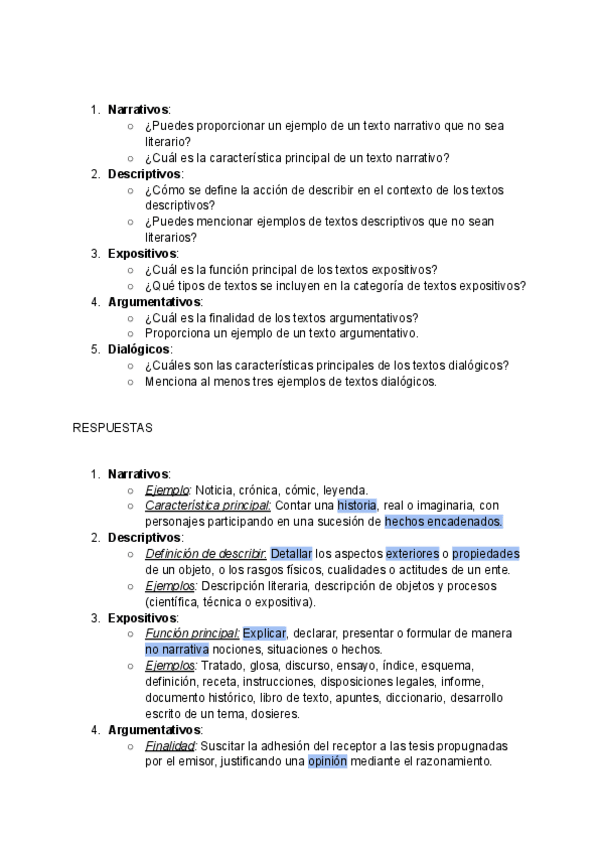 En este documento aparecen preguntas sobre tipos de textos en la lengua castellana. Es un ejemplo de posibles preguntas de examen que podeis usar para practicar