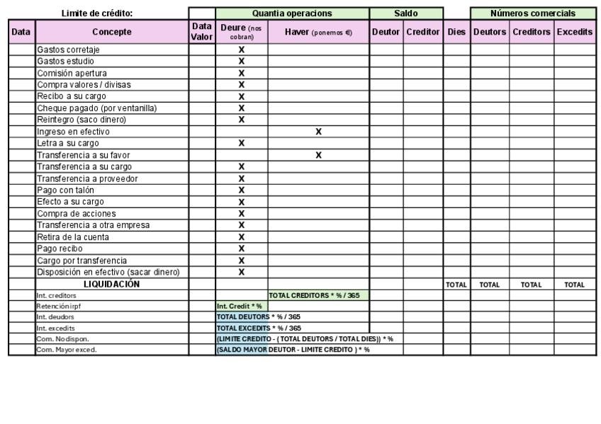 Plantilla liquidación cuenta de crédito. Saldo Deudor / Acreedor Deudores. Acreedores. Excedidos