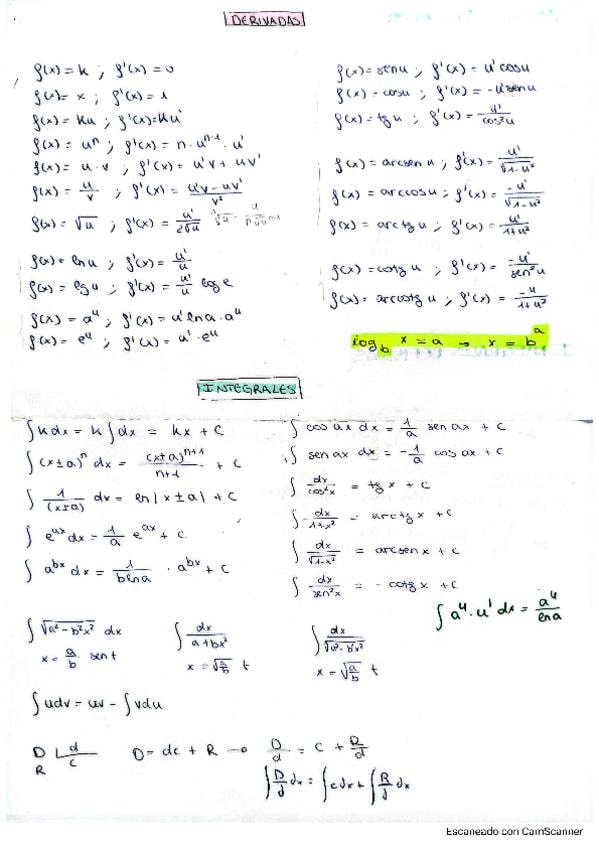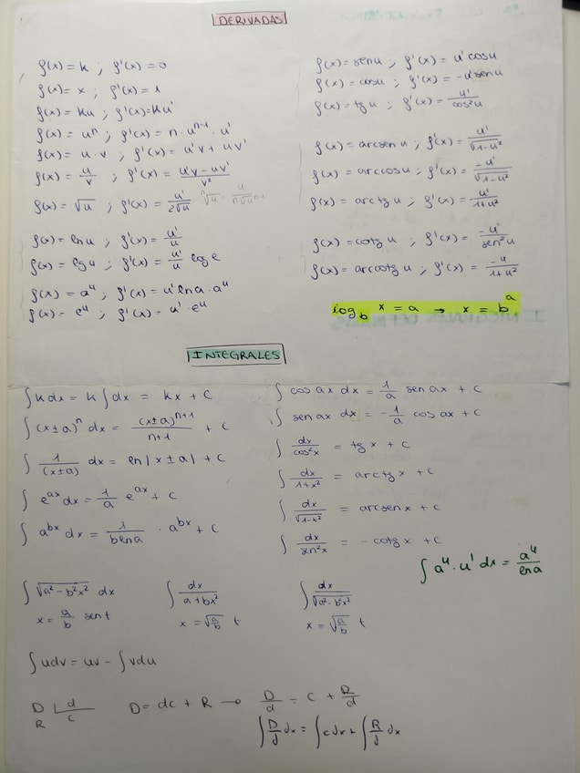 Tablas con todas las fórmulas de las derivadas e integrales
