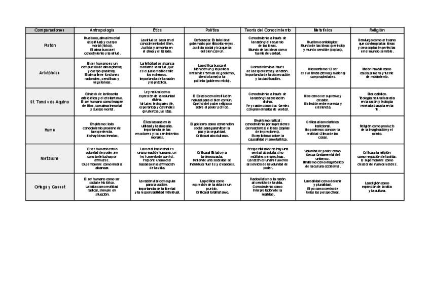 Está tabla pone el pensamiento de cada autor en diferentes temas filosóficos. Puedes utilizarla para la pregunta de la PAU sobre la comparación entre autores, enlazando los pensamientos de cada tema en aproximadamente 2-3 párrafos