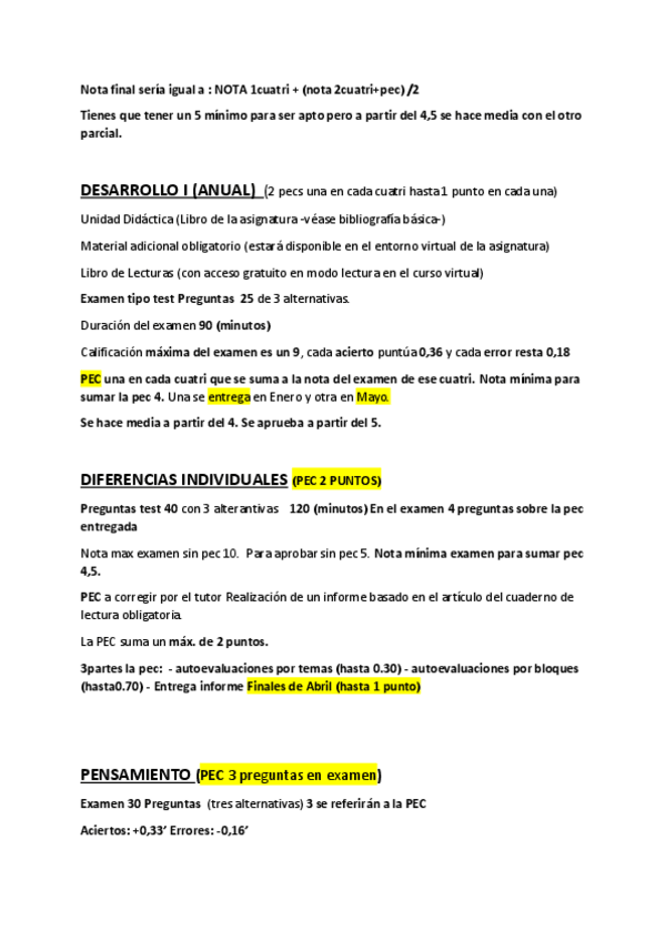 En este documento encontrarás los detalles más importantes de cada asignatura. Todos los detalles están sacados de las guías oficiales. Encontrarás cuantas preguntas tiene el examen, si hay pec o no y otros detalles de forma concentrada en un documento.