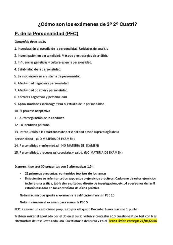 Resumen de los puntos más importantes de la guía unificada de cada una de las asignaturas del 2º cuatrimestre de 3º del Grado de Psicología de la UNED. Si tienen pec, fechas de entrega, nota mínima, cómo es el examen...