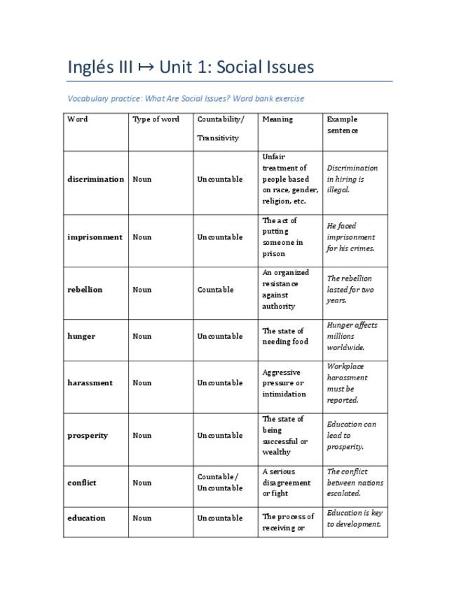 Este documento reúne el vocabulario esencial de la Unidad 1 (Social Issues) con definiciones claras, tipo de palabra, ejemplos y expresiones frecuentes. Ideal para: estudiantes de Lenguas Modernas, preparación de examen final, y para repasar vocabulario t