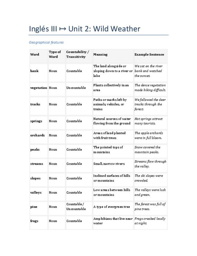 Este documento reúne el vocabulario esencial sobre clima y fenómenos naturales de la Unidad 2, con definiciones claras, tipo de palabra y ejemplos prácticos. Ideal para estudiantes de Lenguas Modernas, preparación de examen final, y para repasar vocabular