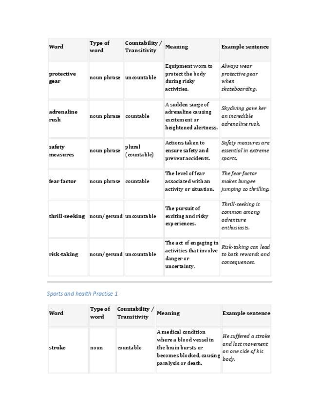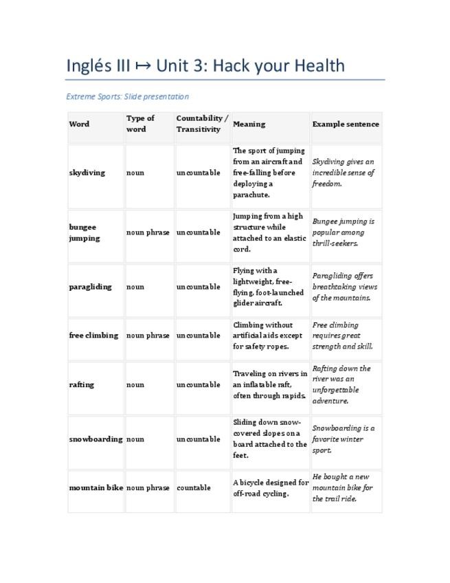 Este documento reúne el vocabulario esencial sobre salud, ejercicio y deportes extremos de la Unidad 3, con definiciones claras, tipo de palabra y ejemplos prácticos. Ideal para estudiantes de Lenguas Modernas, preparación de examen final, y para repasar
