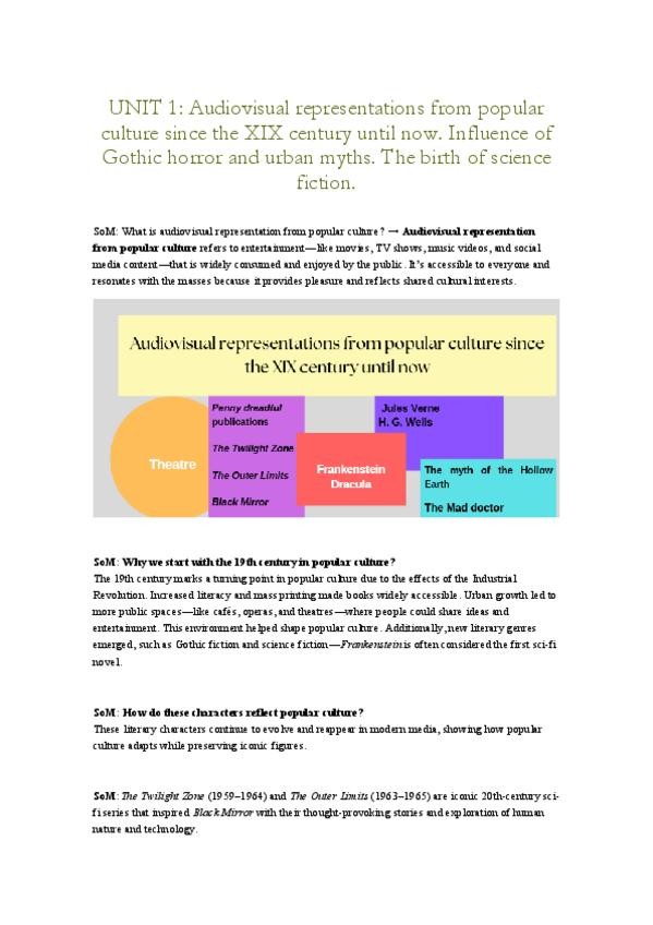 Este documento reúne todo el contenido clave sobre la evolución de la cultura popular y sus representaciones audiovisuales desde el siglo XIX hasta hoy. Ideal para estudiantes de Lenguas Modernas, preparación de examen final.