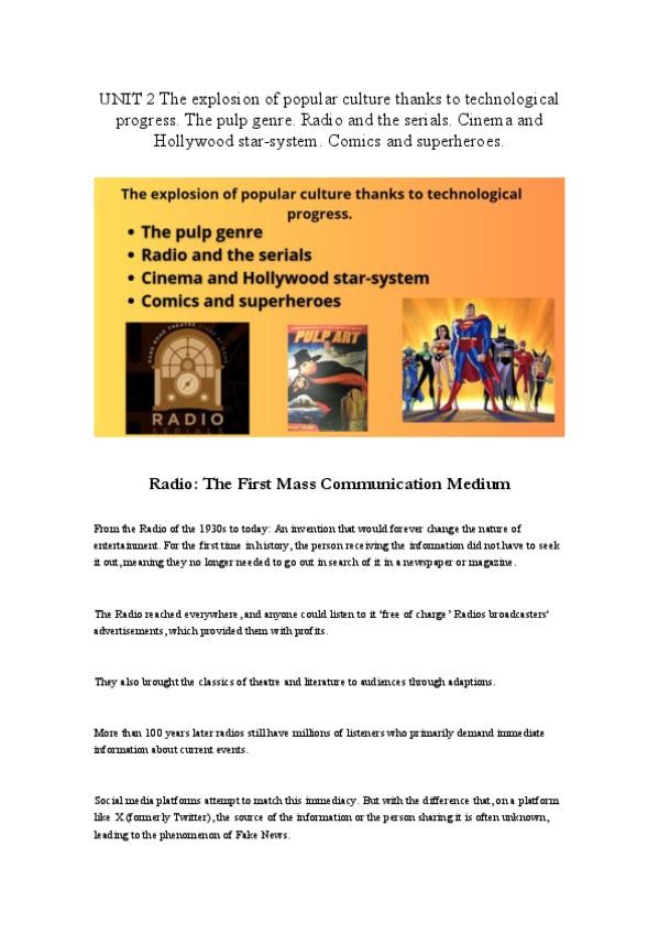 Este documento reúne todo el contenido clave sobre la expansión de la cultura popular gracias al progreso tecnológico. Ideal para estudiantes de Lenguas Modernas. Preparación para el examen final.
