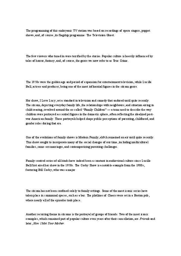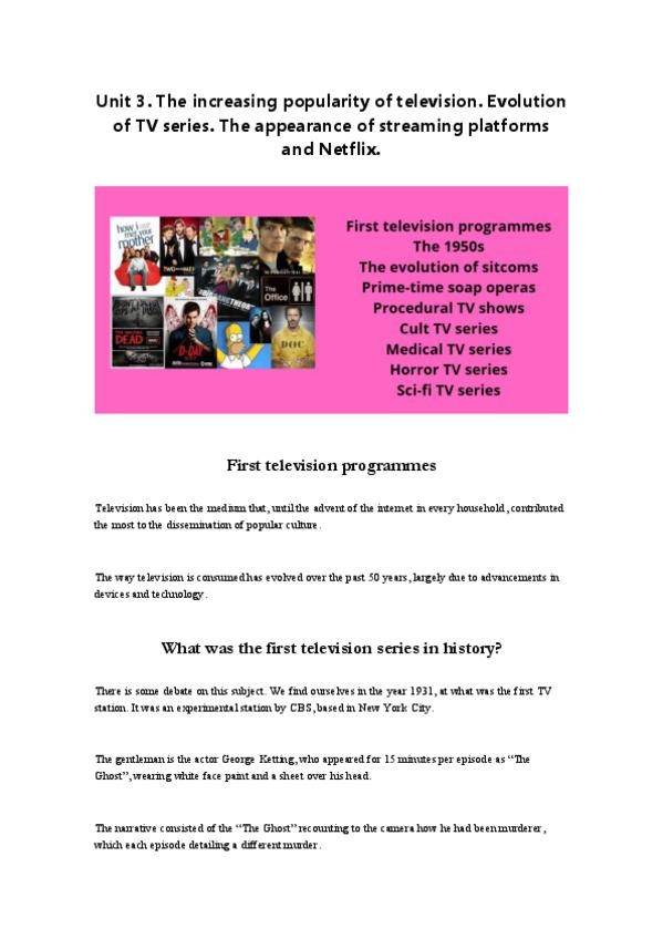 Este documento reúne todo el contenido clave sobre la evolución de la televisión y las series desde sus inicios hasta la era del streaming. Ideal para: estudiantes de Lenguas Modernas, preparación para examen final