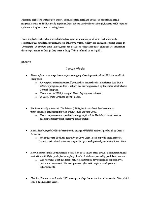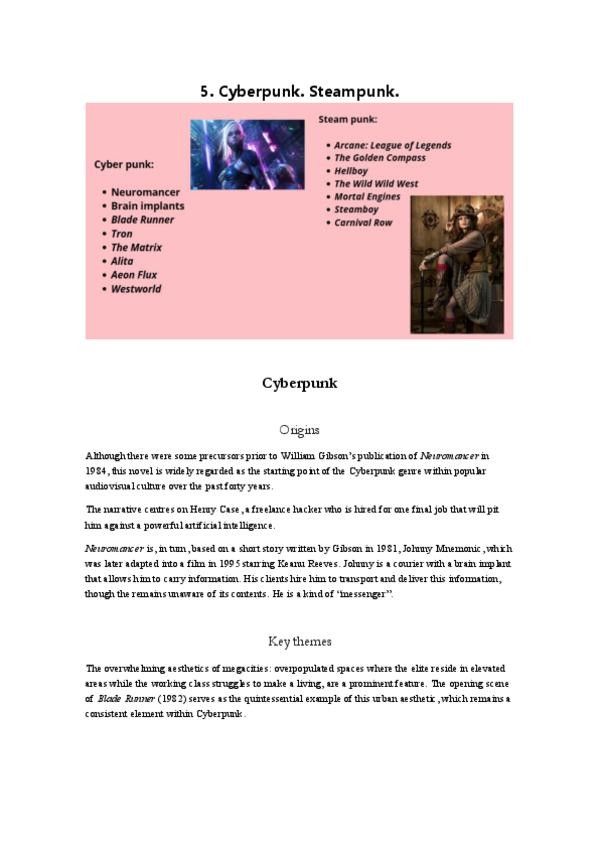 ✔ Cyberpunk Origen con Neuromancer (1984) y Johnny Mnemonic. Temas: megaciudades, hackers, IA, implantes cerebrales, realidad virtual. Obras icónicas: Blade Runner, Tron, The Matrix, Alita: Battle Angel, Aeon Flux. ✔ Steampunk Estética retrofuturista b