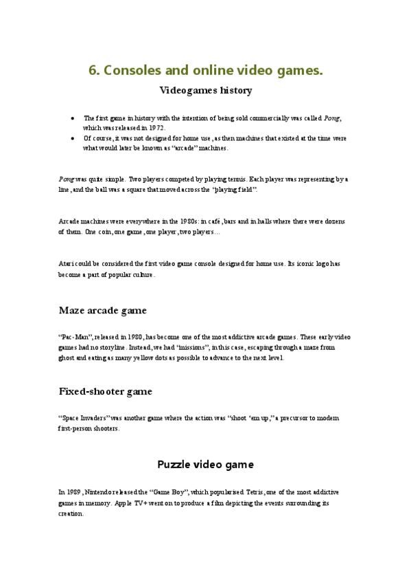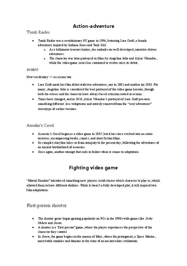 ✔ Historia del videojuego Primeros juegos: Pong (1972), Pac-Man, Space Invaders. Consolas icónicas: Atari, Nintendo Game Boy. ✔ Géneros y franquicias Acción-aventura: Tomb Raider, Assassin’s Creed. Fighting: Mortal Kombat. Shooter: Doom, Halo. Platafor