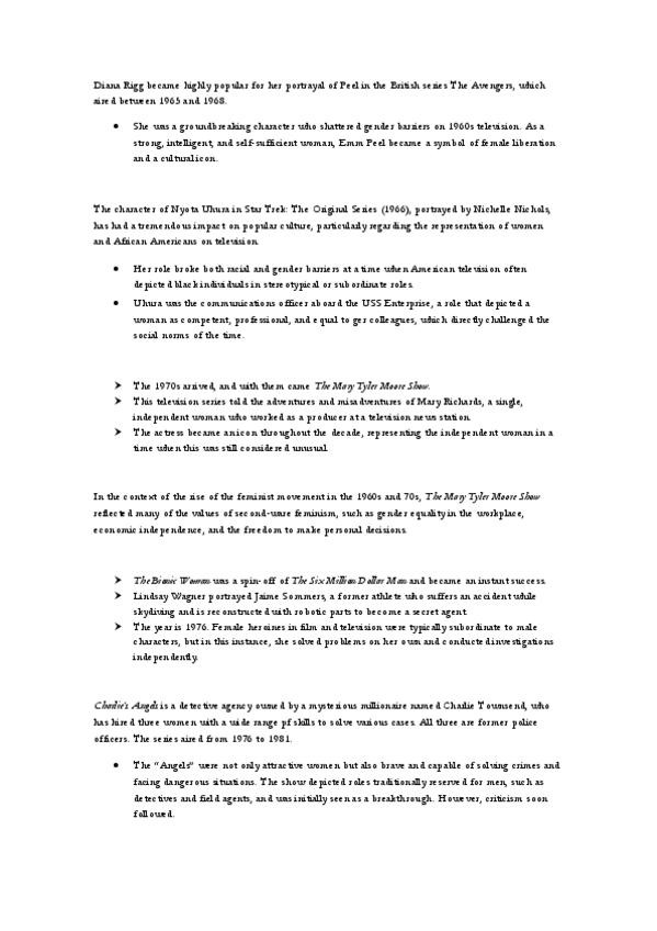 ✔ De los años 50 a hoy Estereotipos iniciales: ama de casa, femme fatale. Personajes que rompieron moldes: Emma Peel (The Avengers), Nyota Uhura (Star Trek), Mary Richards (The Mary Tyler Moore Show). Heroínas icónicas: Ellen Ripley (Alien), Sarah Conno