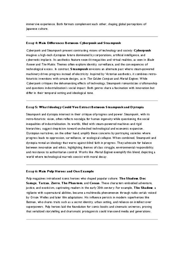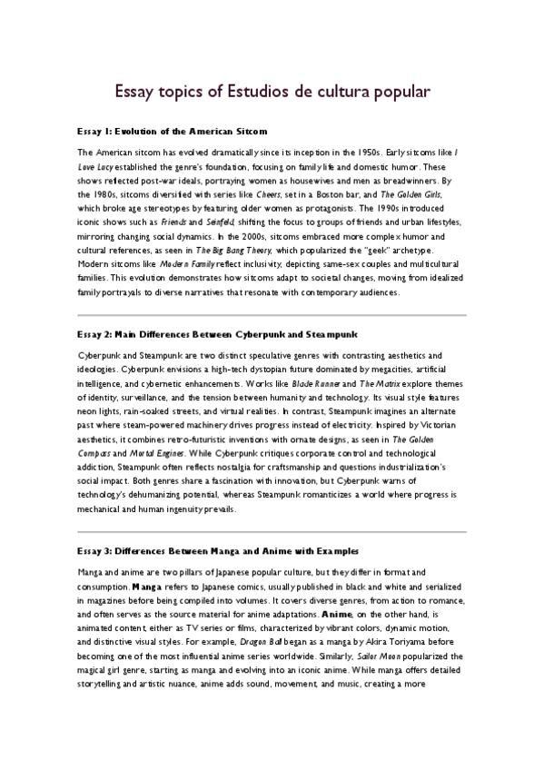 Posibles temas para ensayos (Estudios de Cultura Popular) ✔ Evolución del sitcom americano ✔ Cyberpunk vs Steampunk ✔ Manga vs Anime ✔ Ideología en Steampunk y distopía ✔ Héroes pulp y su legado ✔ Indiana Jones y la tradición pulp