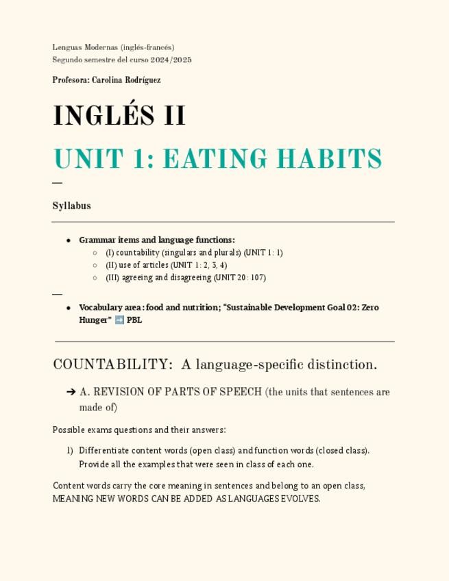 La unidad se centra en hábitos alimenticios y combina aspectos gramaticales, vocabulario y funciones comunicativas.