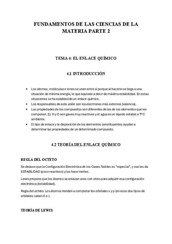 Apuntes de Fundamentos de las Ciencias de la Materia. Temas 4 (Enlace Químico), 5 (Cinética Química) y 6 (Equilibrio químico).